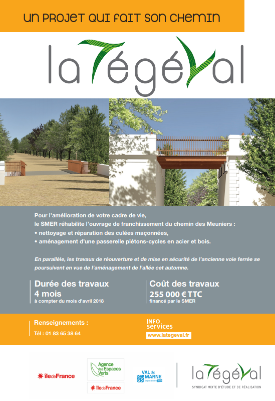 Les travaux de la Tégéval continuent, pour 2018 trois gros chantiers ont démarré, le passage du pont de chemin de fer à Valenton, juste après le SIAAP et avant la plage Bleue, le passage de l'avenue Foreau et le franchissement du chemin des Meuniers aux pieds des tennis à Villecresnes.